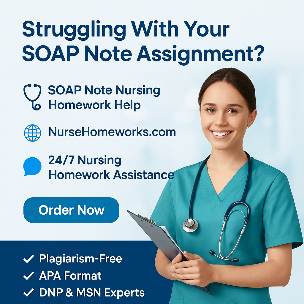 At NurseHomeworks.com, we provide SOAP note nursing homework help tailored for BSN, MSN, and DNP students who want to submit professionally written, patient-focused, and APA-formatted SOAP notes that meet clinical documentation standards.